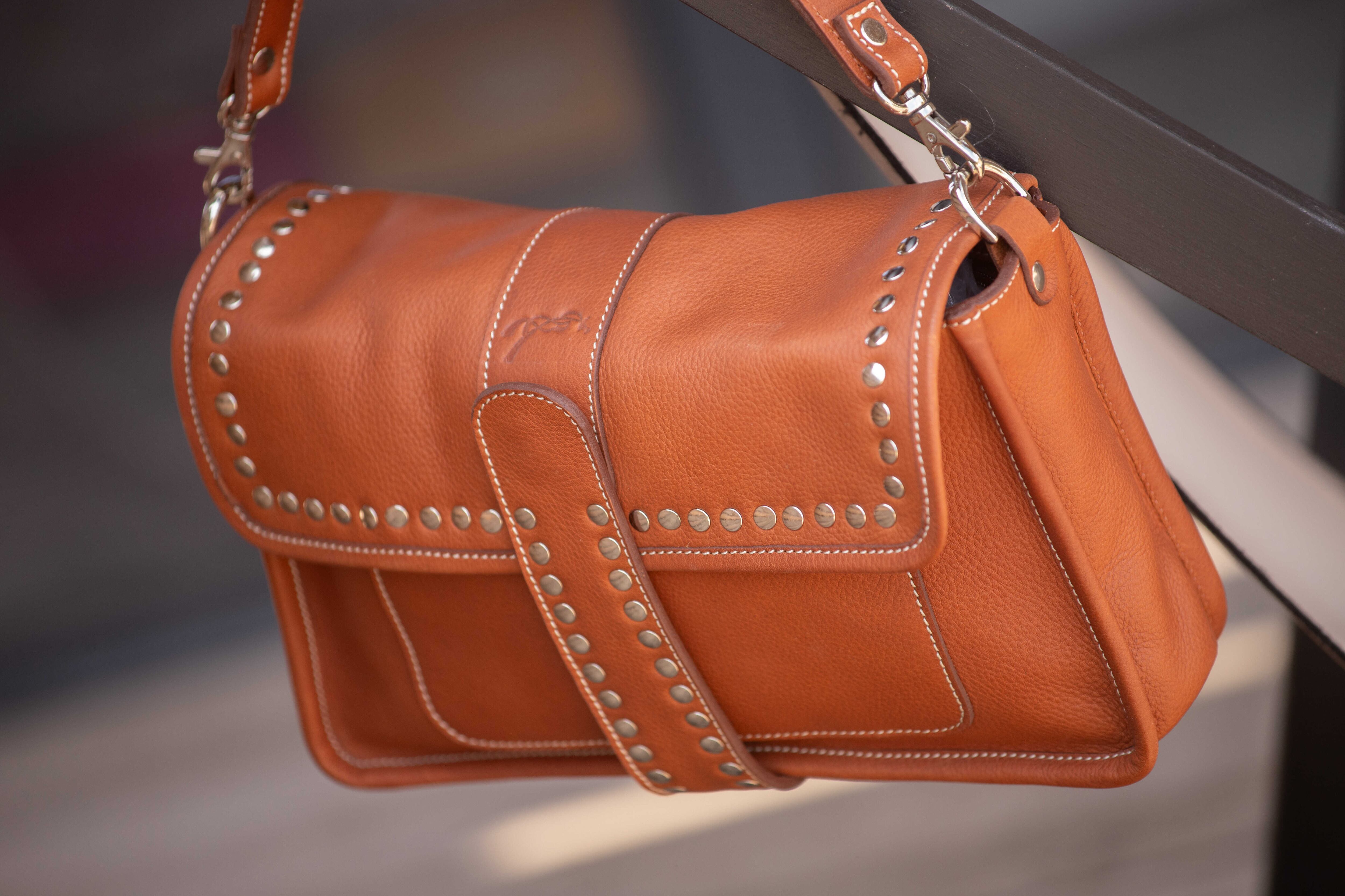 長方形フォルムとスタッズが目を引く、上品で洗練されたレザーバッグ「Cavalia」。