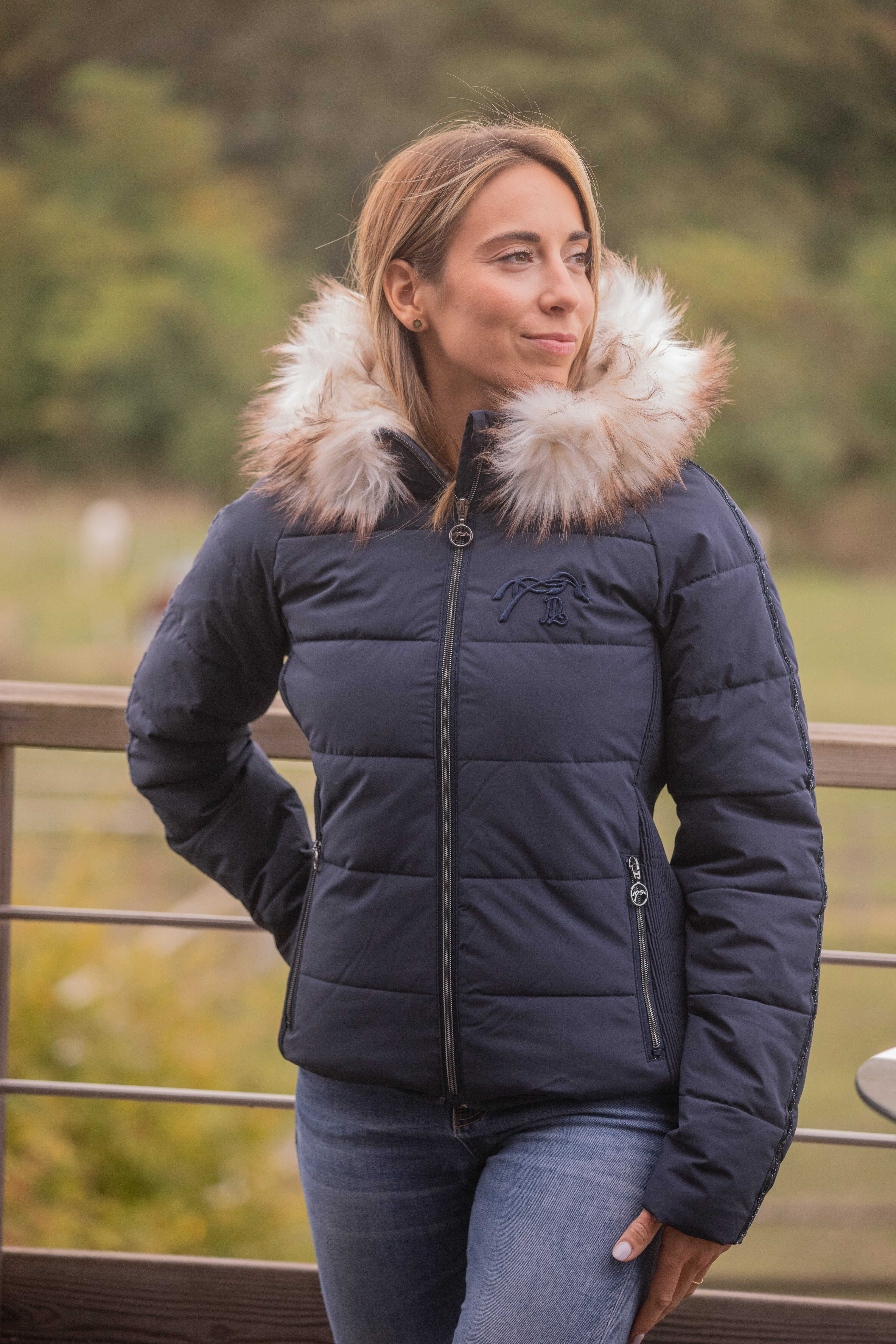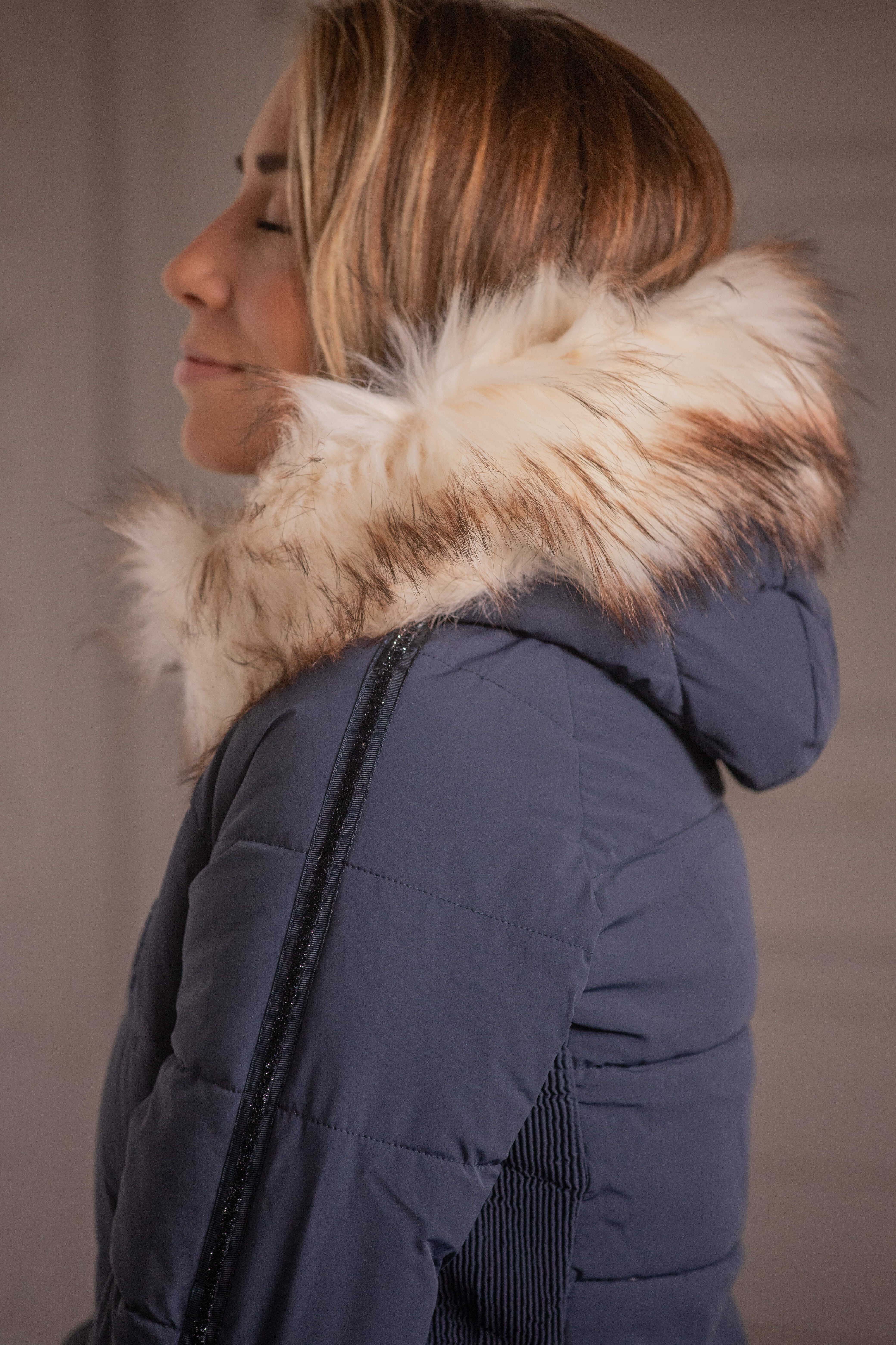 胸元には同色の立体刺繍ロゴ入り、取り外し可能なフードには上品なフェイクファー付き。