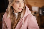 大きめのフードには超ソフトなフリース裏地を使用しており、ベージュのドローコードで調整が可能です。