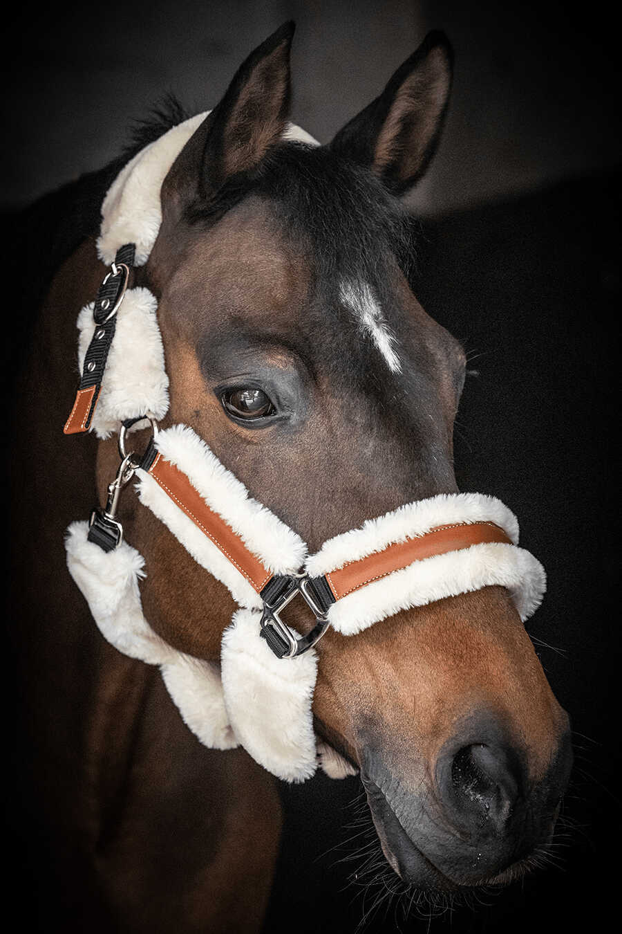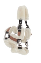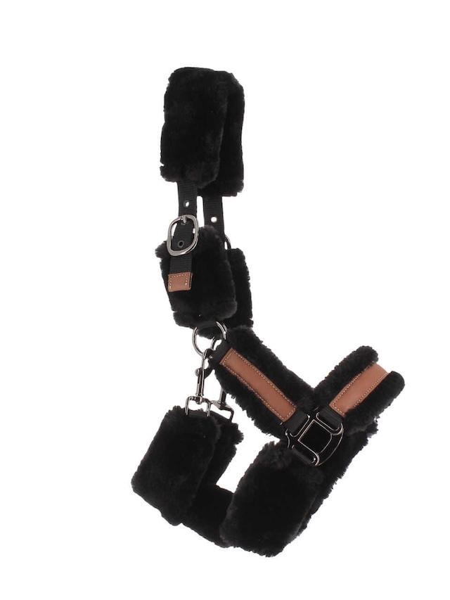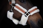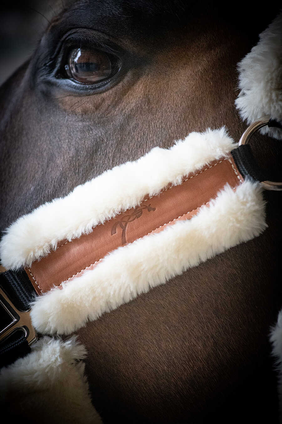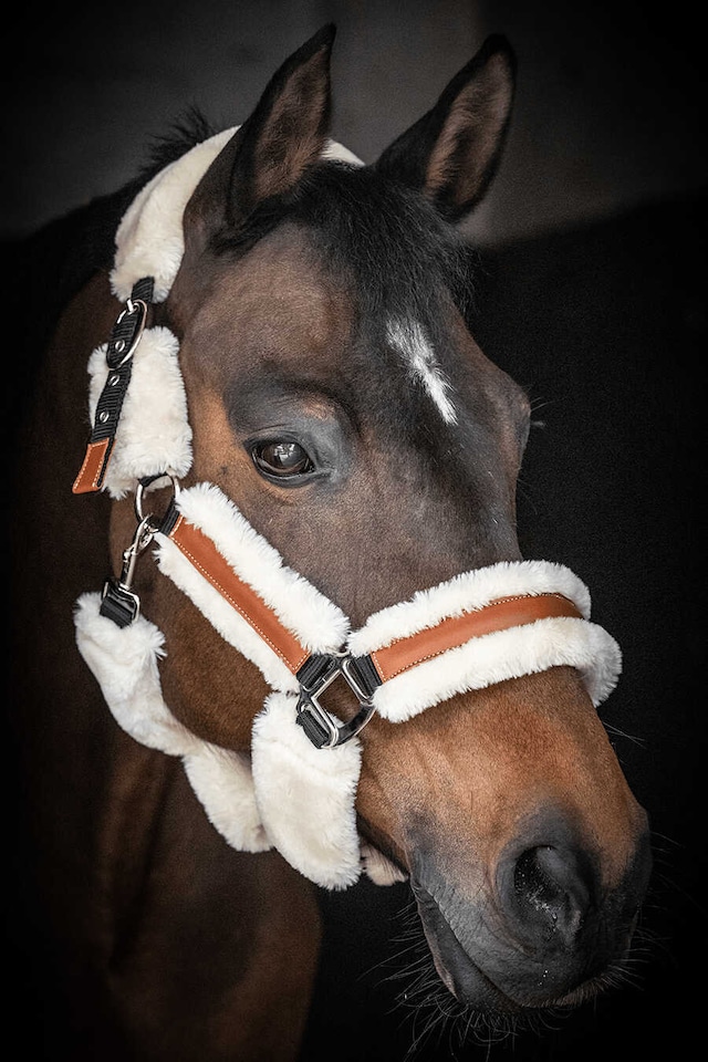 鼻革と左右の頬革にはリアルな質感のフェイクムートンを配し、圧迫や擦れを軽減しながら優しい肌あたりを実現します。