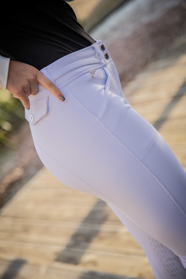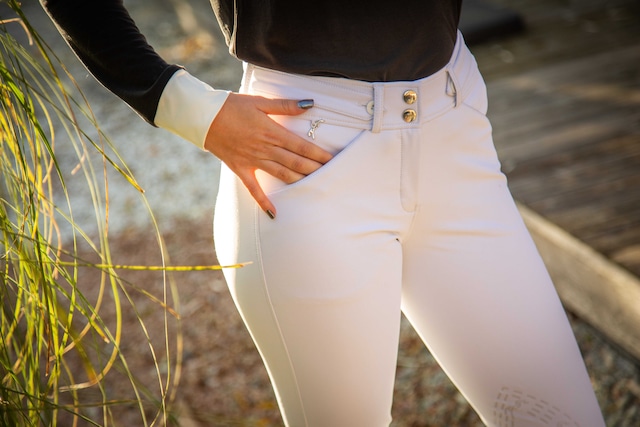 内側には同色シリコングリップとPénélopeロゴを配置し、鞍上での脚の安定性を向上。