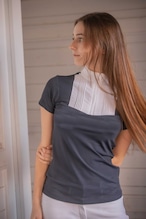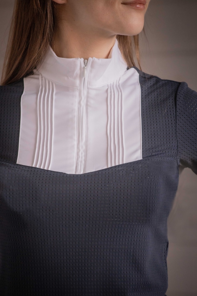 オフィサーカラーに小さな隠しジッパーを備え、胸元の白いプラストロンには細やかなストライプと美しいフロントギャザー。