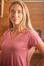 ほんのりツヤ感のある生地が上品な、PENELOPE「Juline」のVネックTシャツです。