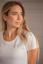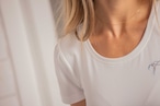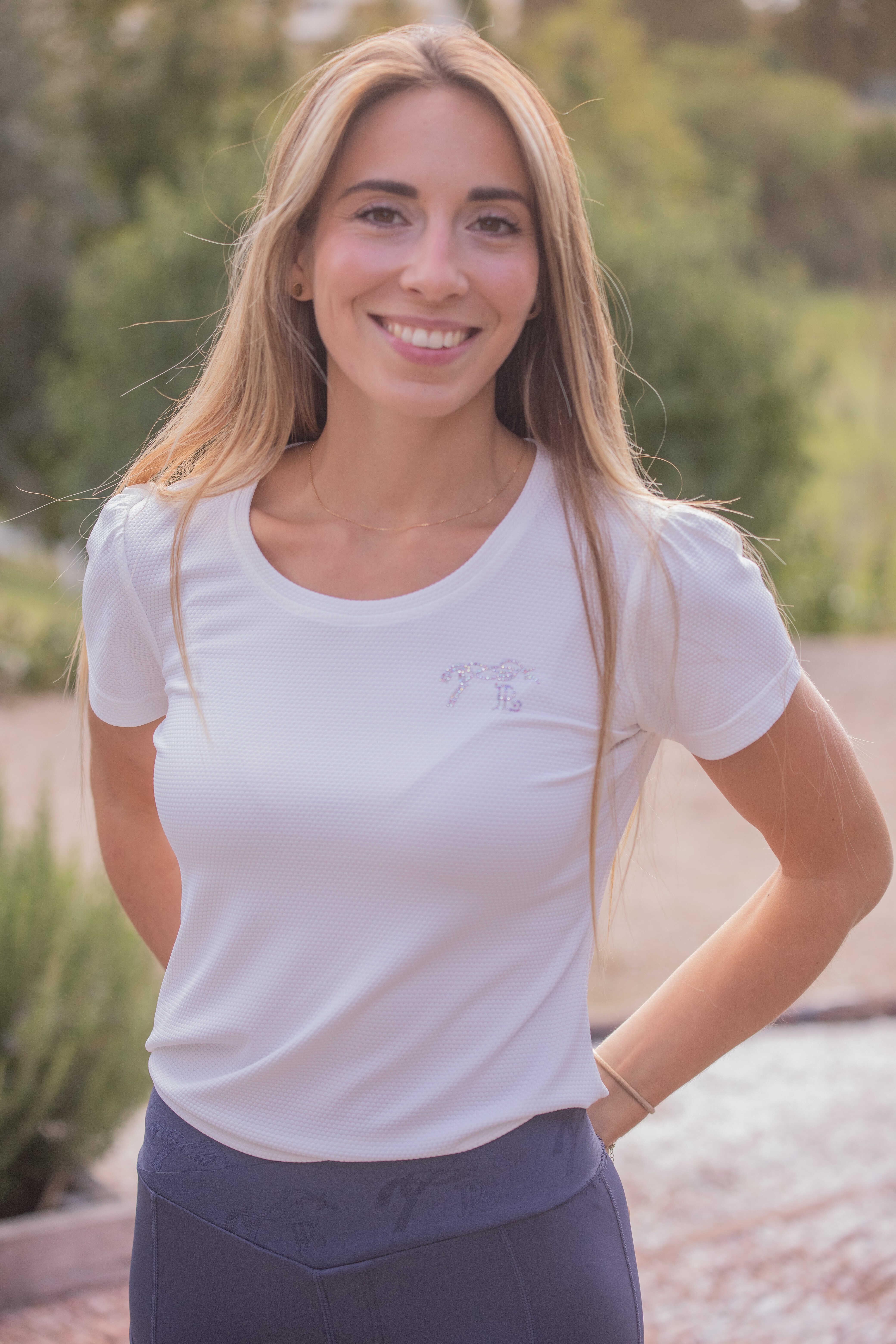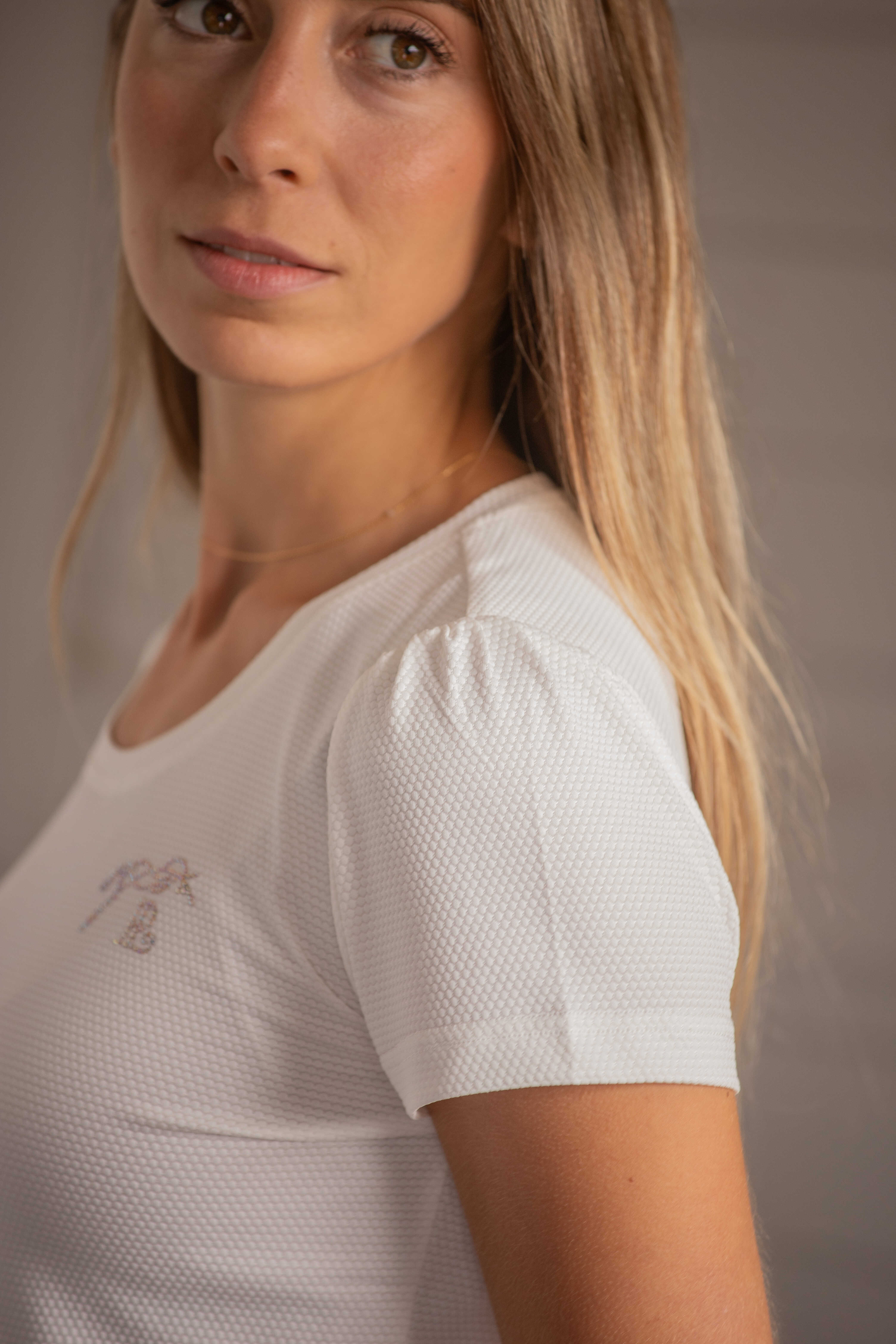 胸元にはラインストーンのロゴをあしらい、控えめな輝きがアクセントになっています。