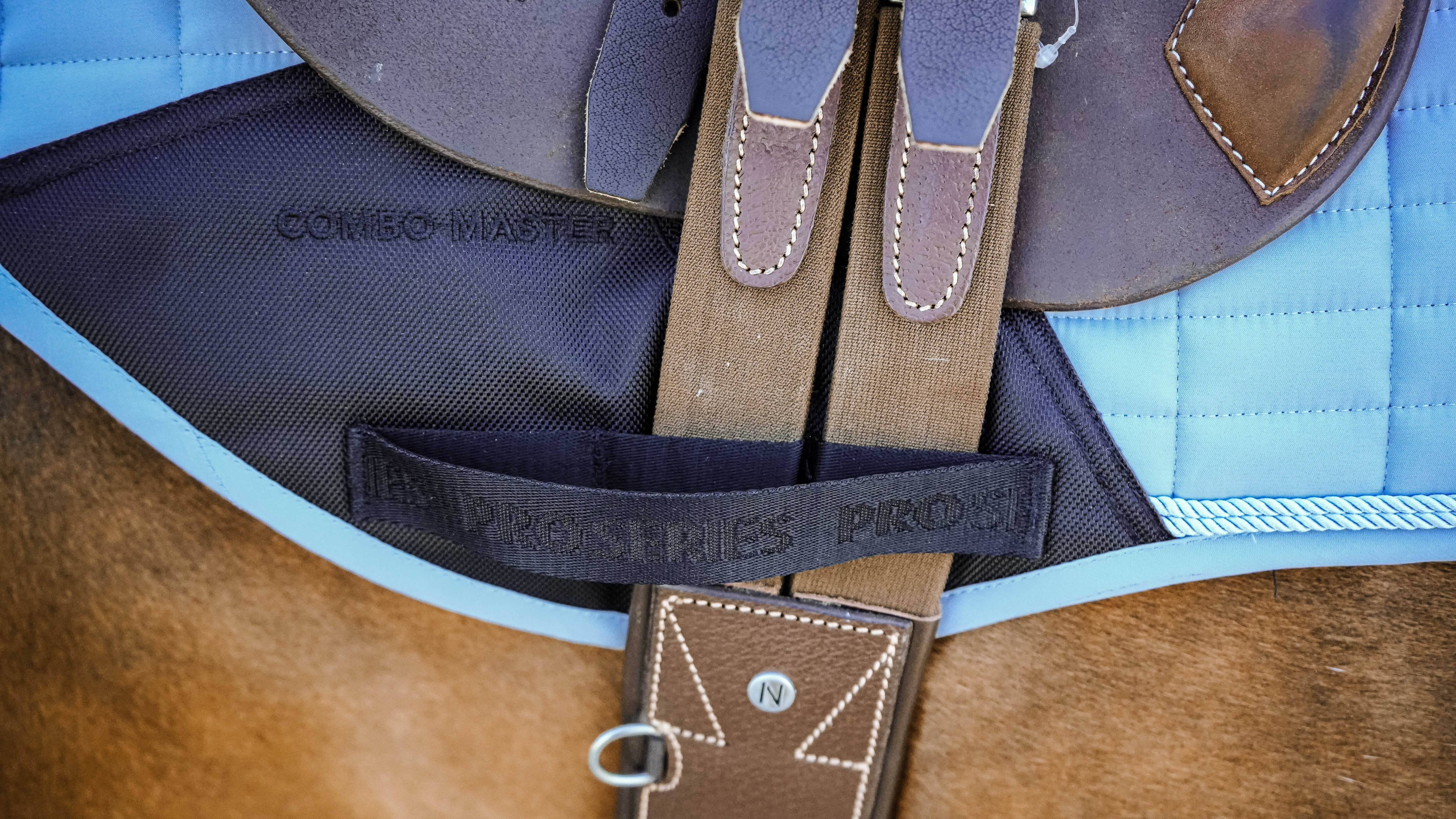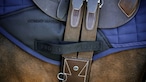 前部ストラップはゴム仕様で、ハーフパッドやサドルときれいに整う設計です。