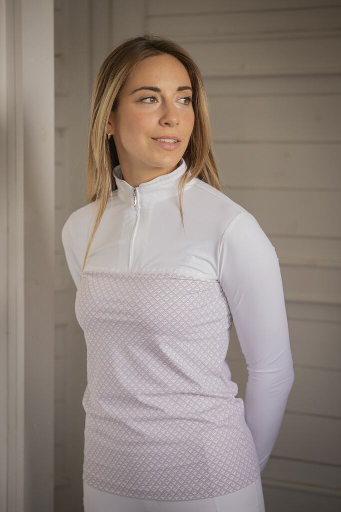 トーン・オン・トーンのペネロペロゴが上品な競技用シャツ。